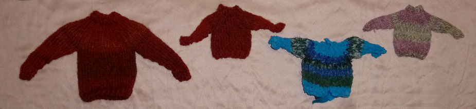 Sweater Ornaments Pattern for ornament sized sweaters in two sizes, one for fine gauge yarns (like sock yarn) and one for thicker gauges. There are also two ways to knit the yoke of the sweater, and two ways to do the sleeves