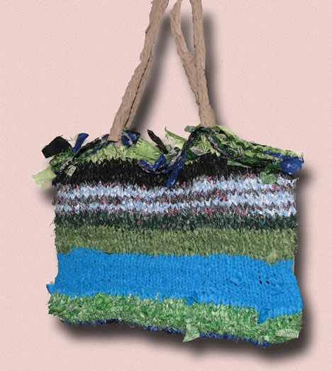 Ella's Fabric Knit Bag. A flat bottomed bag knit from strips of scrap fabric.